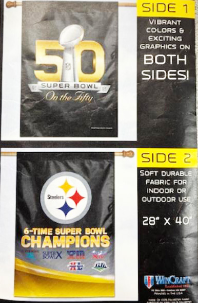 28″ x 40″ Double-sided Steeler Banner. Superbowl 50 on one side / 6-time champions on the other side. Sleeve with tab on top edge slides over pole (pole not included). Image reads in reverse on back side. Officially licensed. Made by Wincraft.